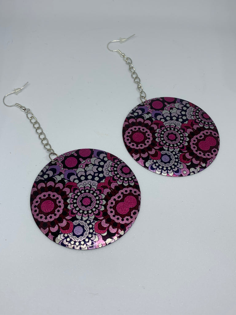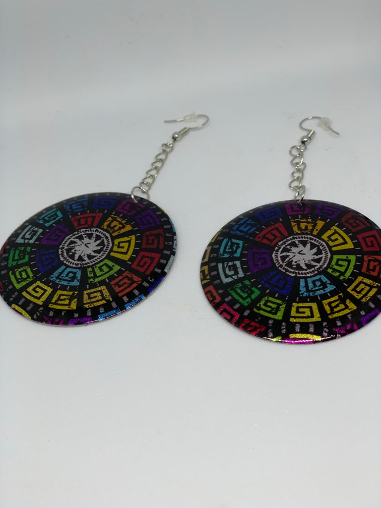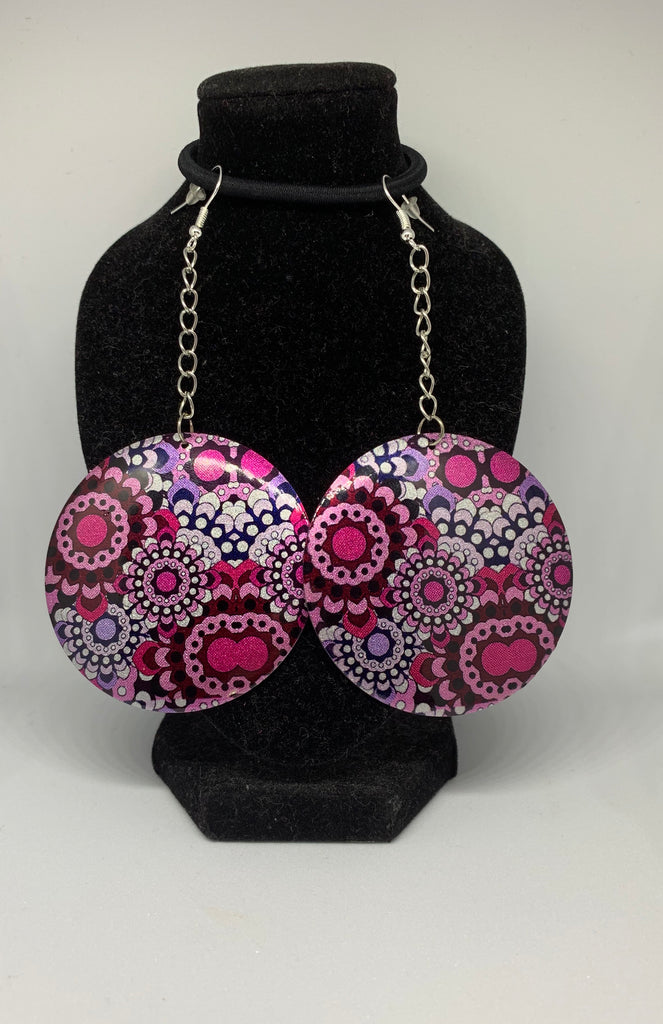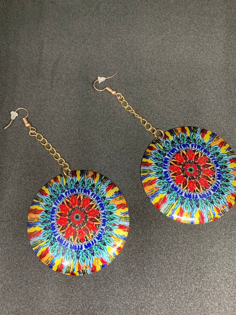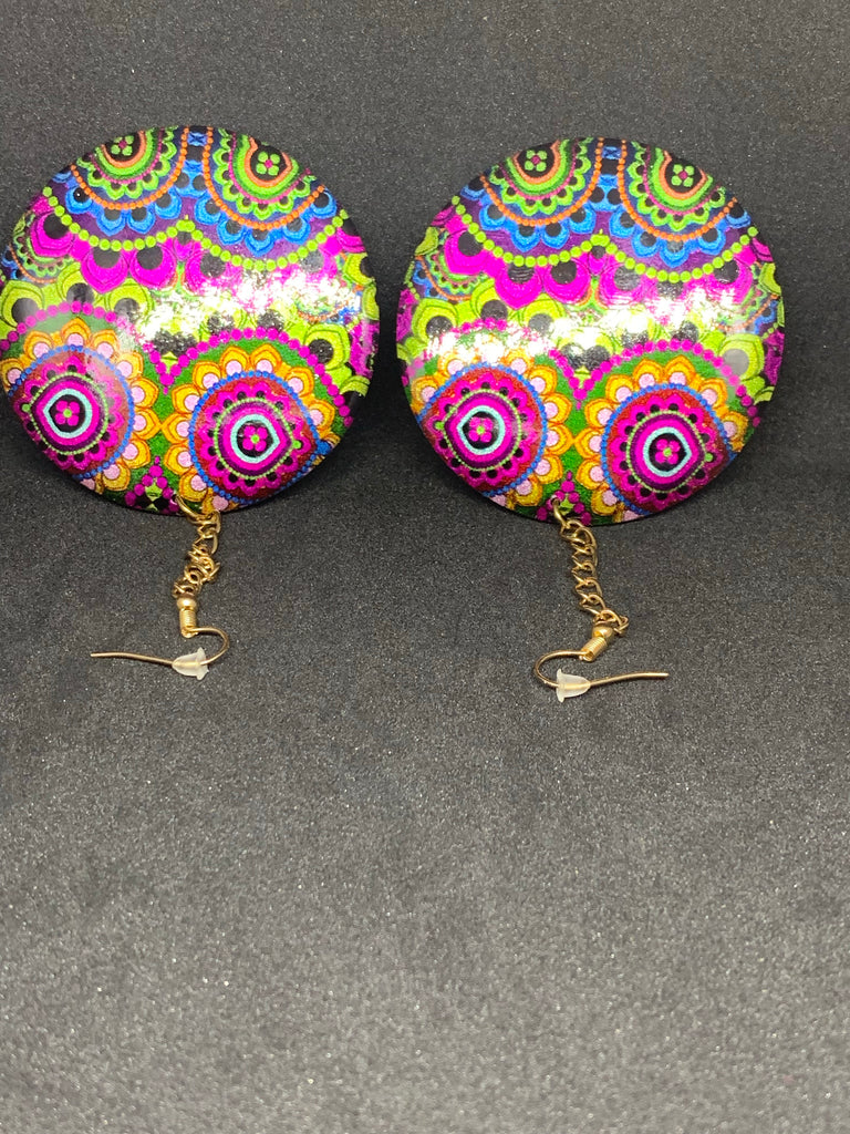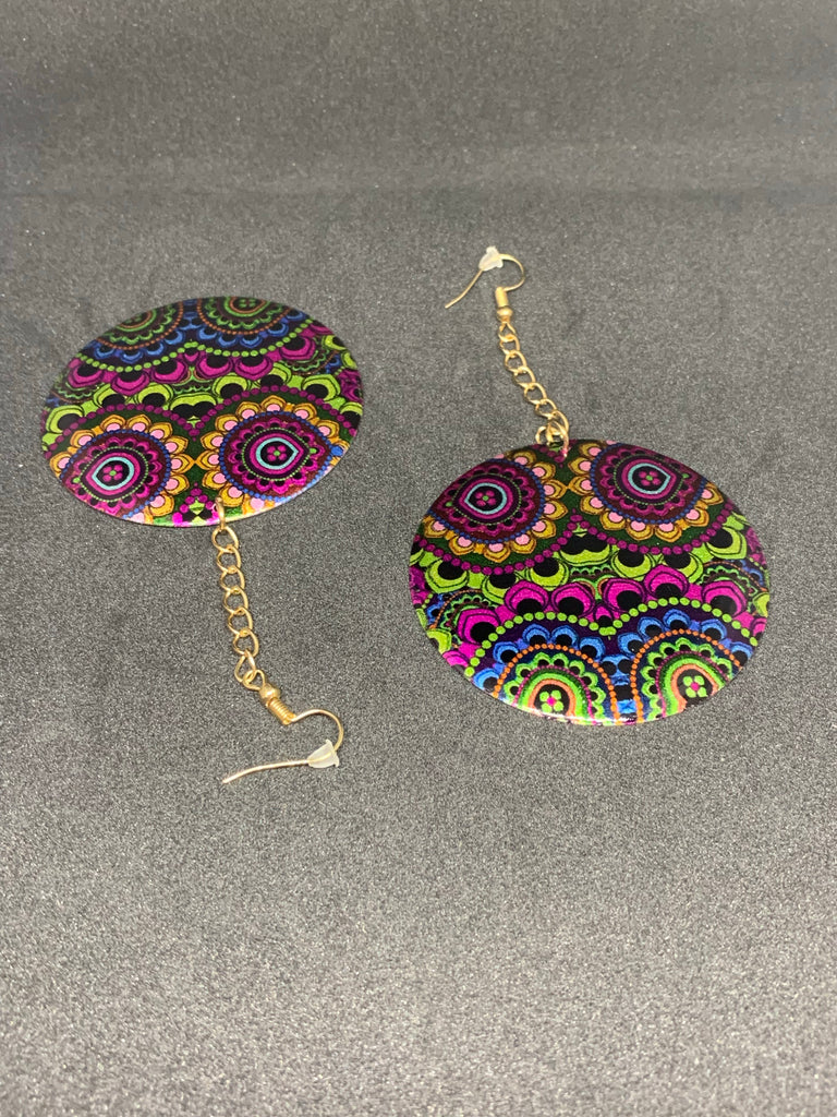 Flat colorful disk shaped fish hook hanging gypsy party earrings, great for a night out with friends, or to wear on special occasions. (Fish hook is Led and nickel free)