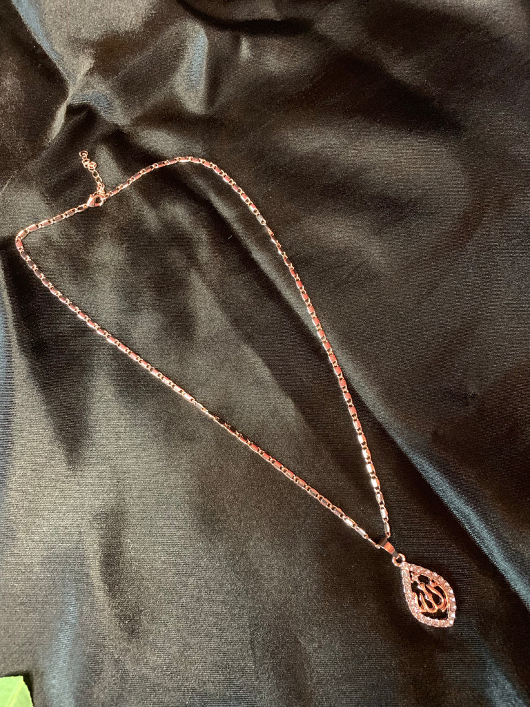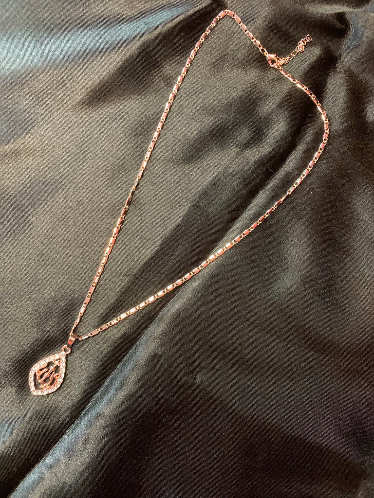 Rose gold short necklace engraved with white rhinestones and Arabic calligraphy.