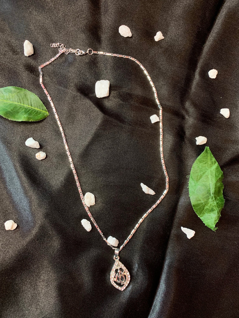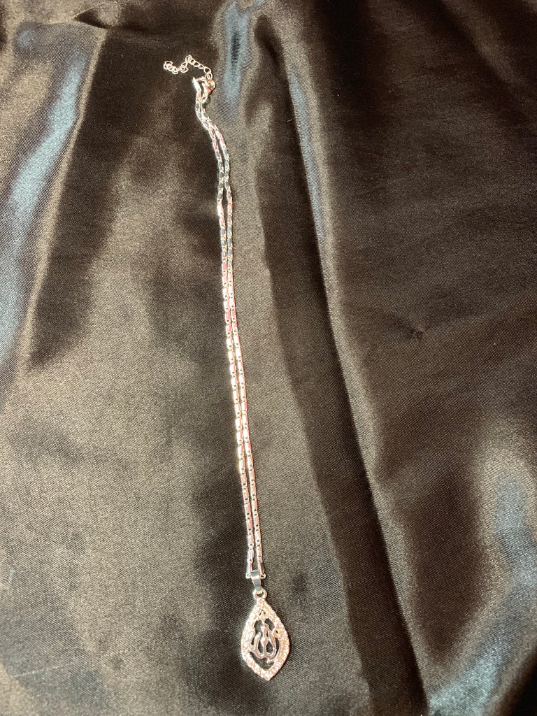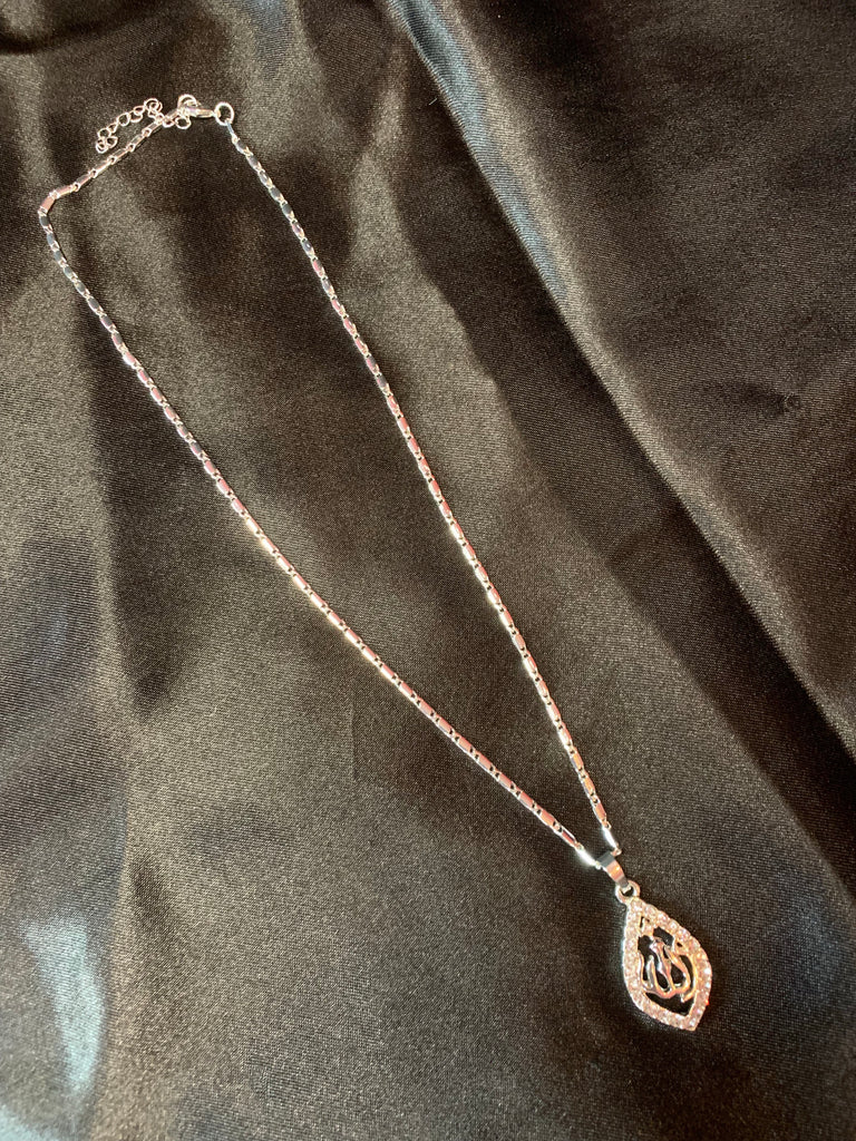 Short silver necklace engraved with white rhinestones and Arabic calligraphy.