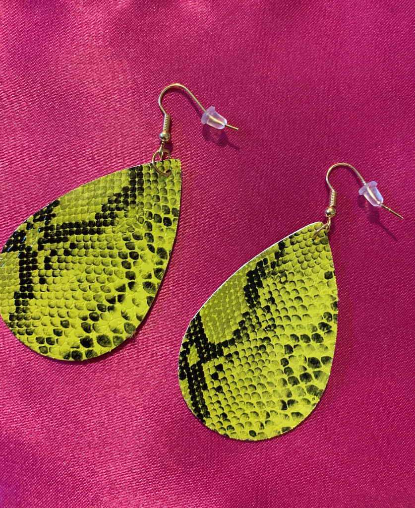 Yellow, fishhook, teardrop shaped, dangle earrings, with snakeskin design. Lead and nickel compliant